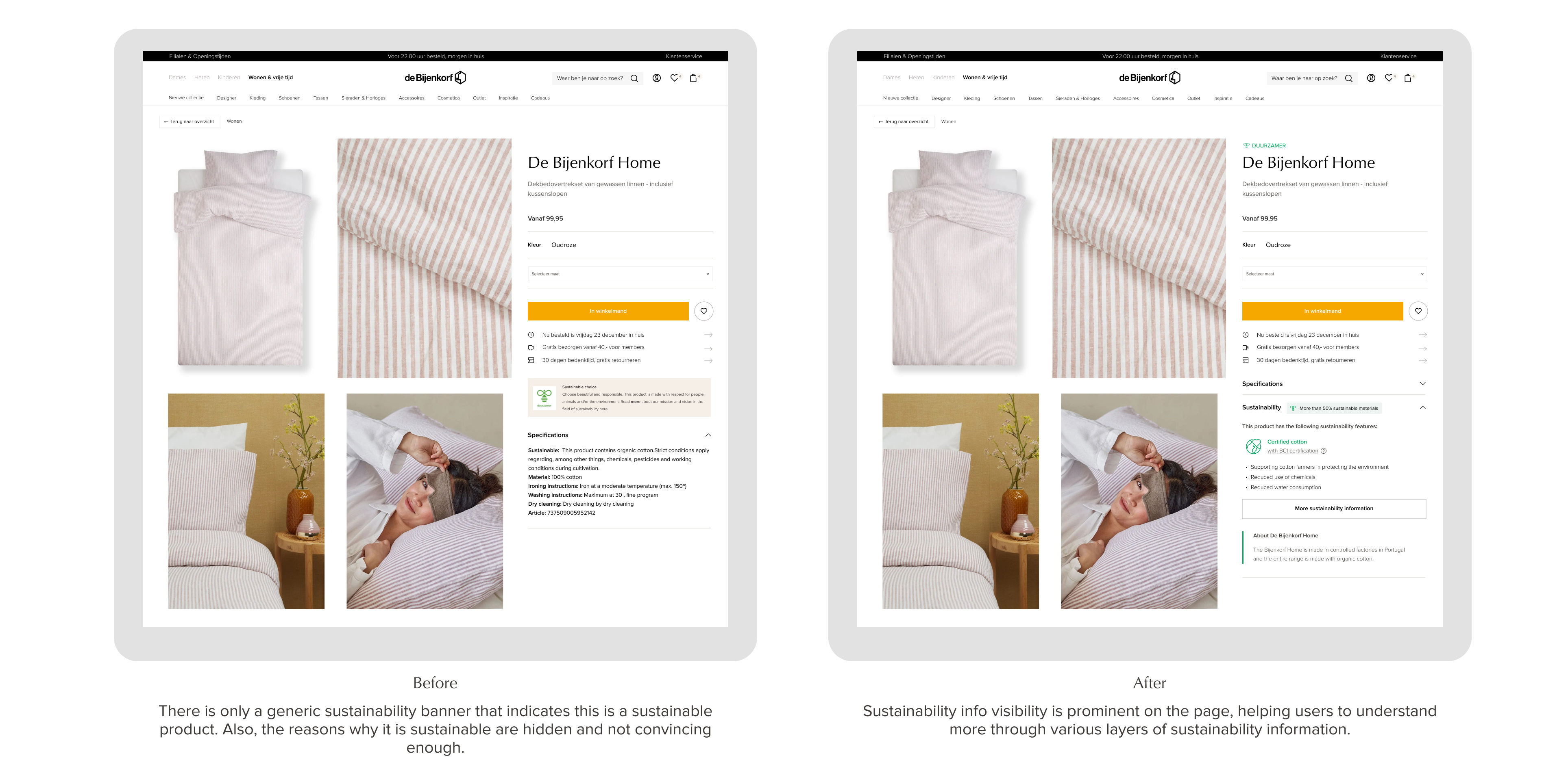 This sustainability project was the first project that I worked in de Bijenkorf, the organization aims to become a top shopping destination for sustainable brands by 2023. My task was to provide the needed sustainability information on the product page